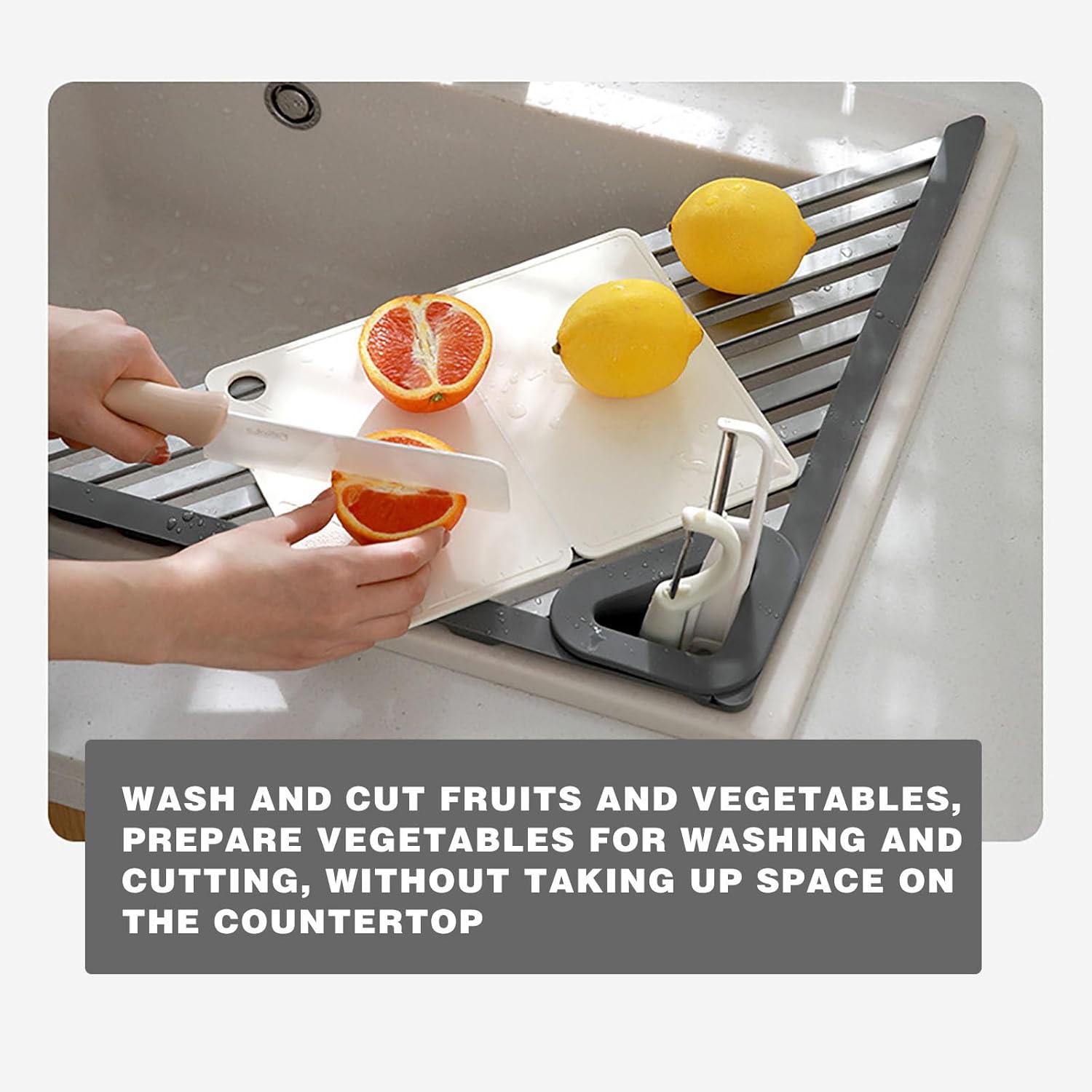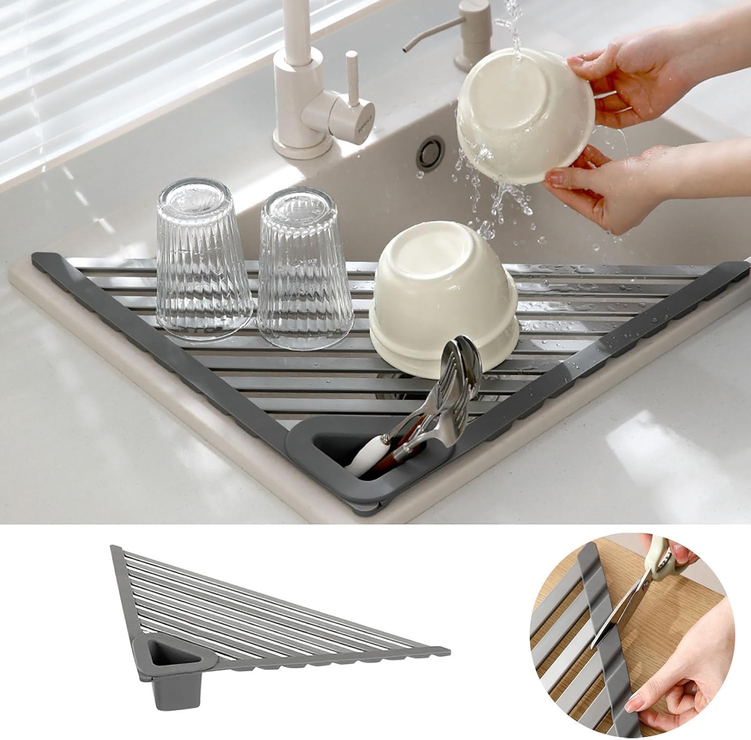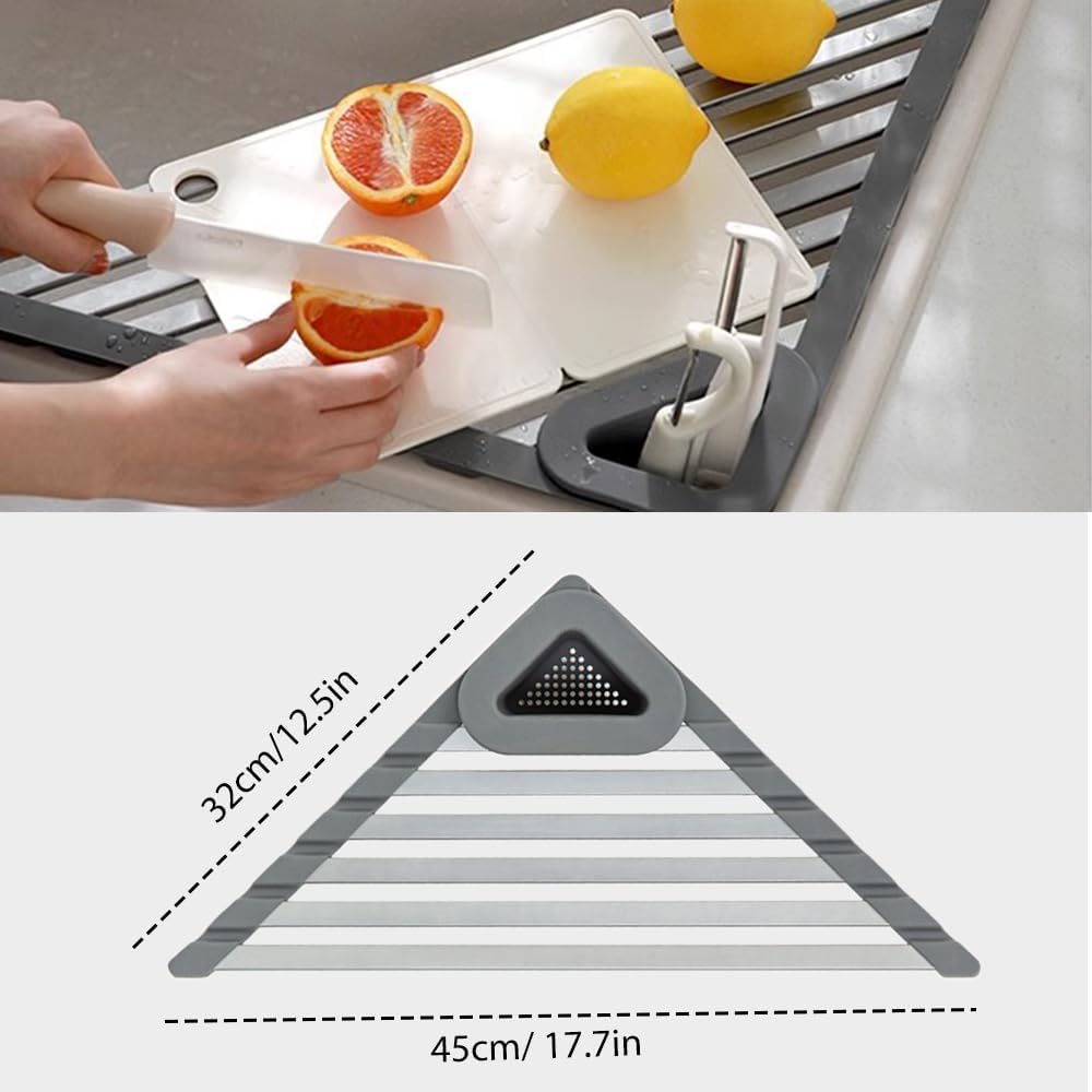 【Versatile Use】This Triangular Drain Rack is robust and can handle heavy loads. It doubles as a small cutting board for fruits and vegetables. a drying rack for dishes. or any other cooking preparation tasks. It helps prevent water on the countertop. providing a clean and organized space.