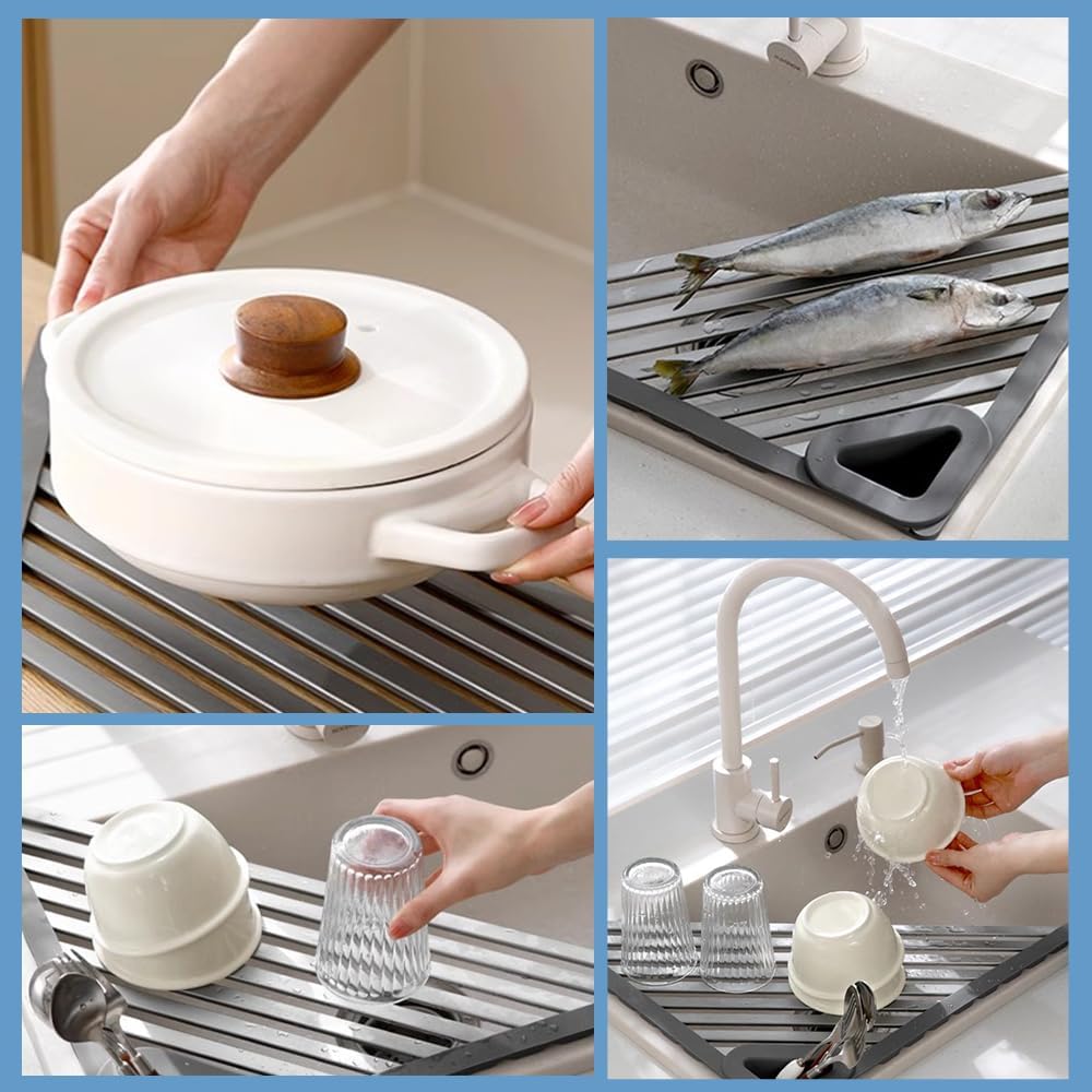 【Space-Saving Design】 The slim and foldable design of this sink drying rack takes up minimal space and can be quickly rolled up for easy storage. reducing kitchen clutter. Suitable for most standard sinks and drawers. please check your sink size before purchasing.