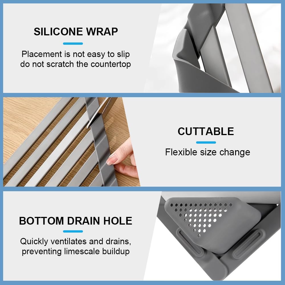 【Premium Materials】 Made from high-quality aluminum alloy and silicone edges. this drying rack for kitchen sink is waterproof. durable. and scratch-resistant. The solid structure features non-slip silicone ends for a secure fit.